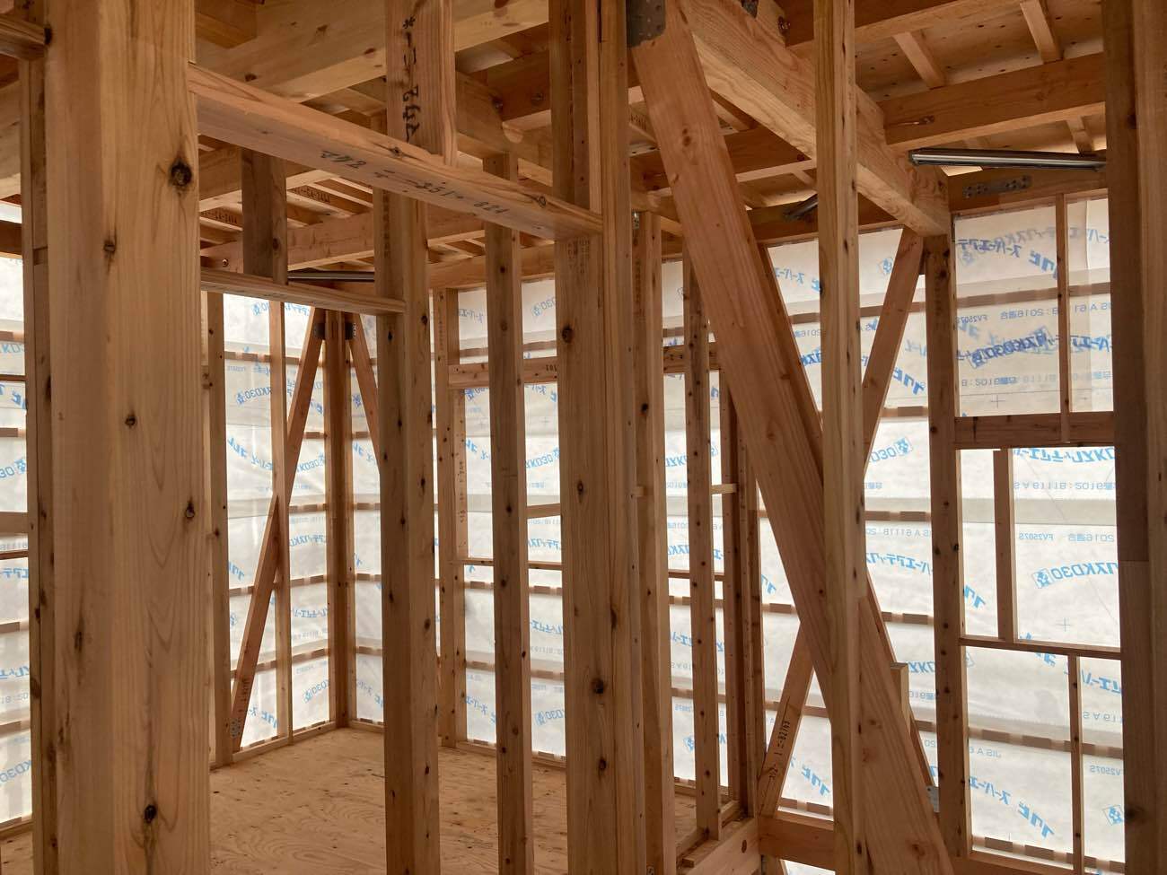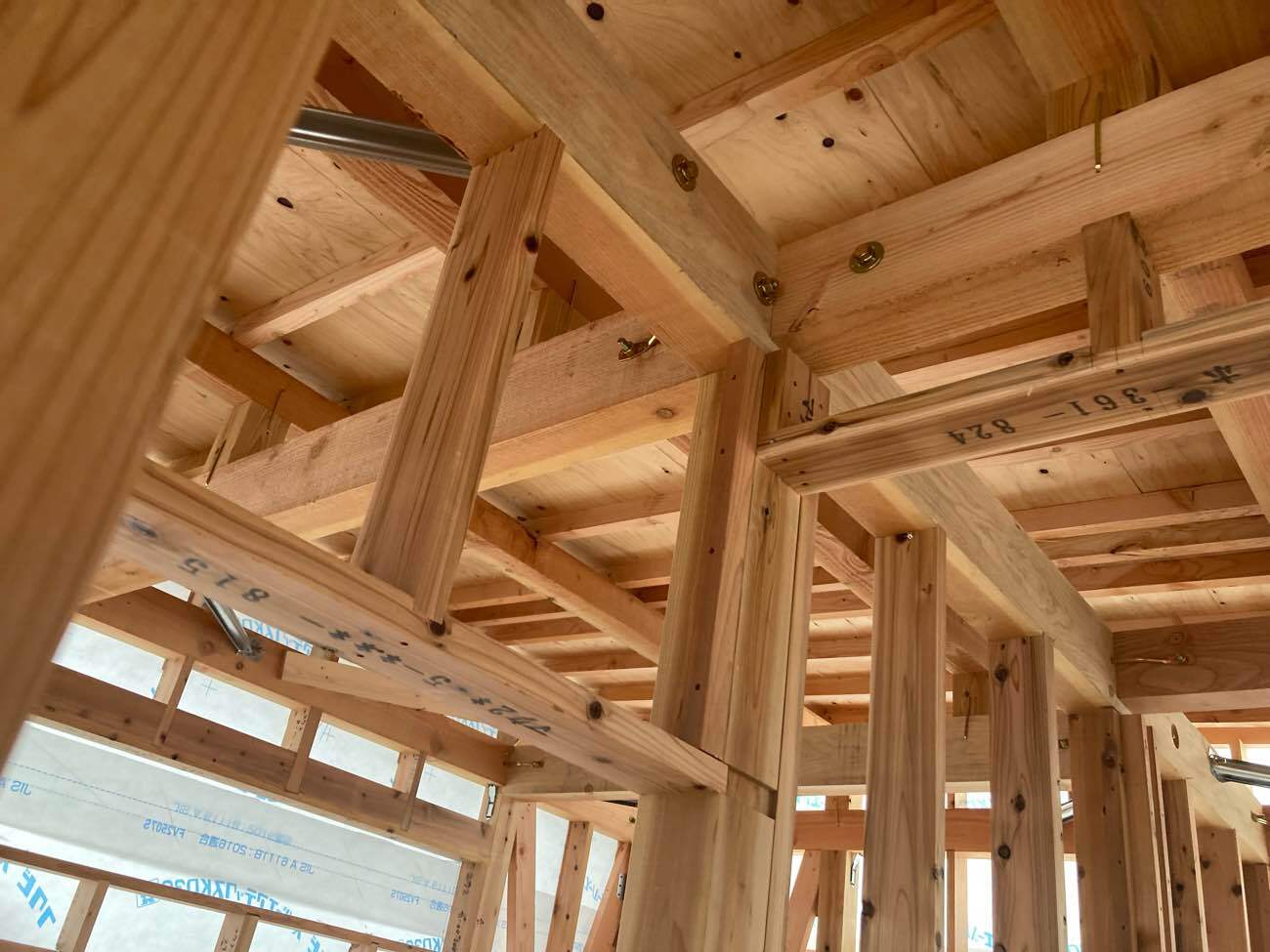 外壁や内装材などで隠れてしまいますが、骨組みを見ると梁や筋交いなど非常に多くの木材が使われているのがわかります。直角に狂いなく組み上げられているのは圧巻ですね!