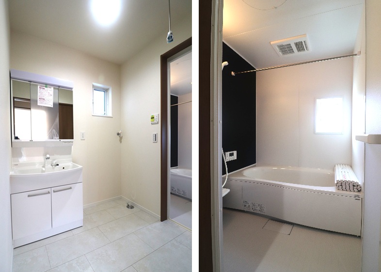 洗面脱衣室と浴室は白を基調とした清潔感のある空間に。