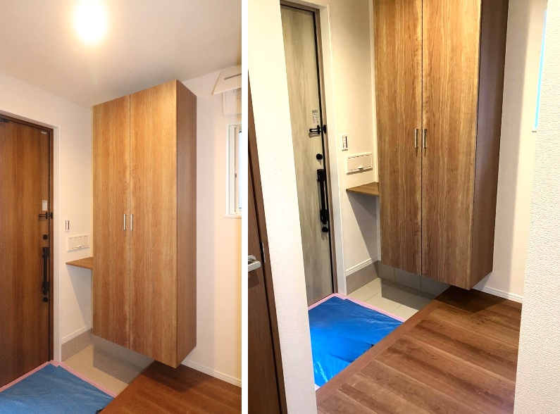 木目調の大容量の靴箱収納が備え付けです。同じ靴箱なのですが、並べてみると玄関扉の色合いや照明の当たり方も影響して印象が変わって見えます。